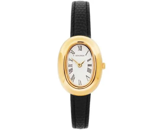 Watch Bellamy White Oval Dial Gold Black Leather Strap 23mm